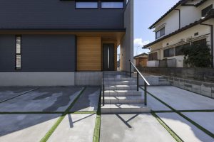 ツートンカラーとすることで重心を下げ、どっしりとした印象に。水平ラインを強調することで更に重心を下げることができるので大型玄関庇を設けました。