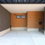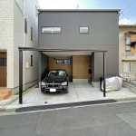 真四角の箱をくり抜いたような外観デザイン。テラス屋根を密着させて、バイク1台と車1台が雨に濡れないようにしました。大きな窓もなくスッキリとした印象です。