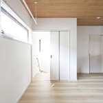 徹底して効率化した間取りプランの一環で、リビングと物干しスペースを兼用。南側隣家からの視線をかわすため、窓計画はハイサイドライト(高天窓)としました。