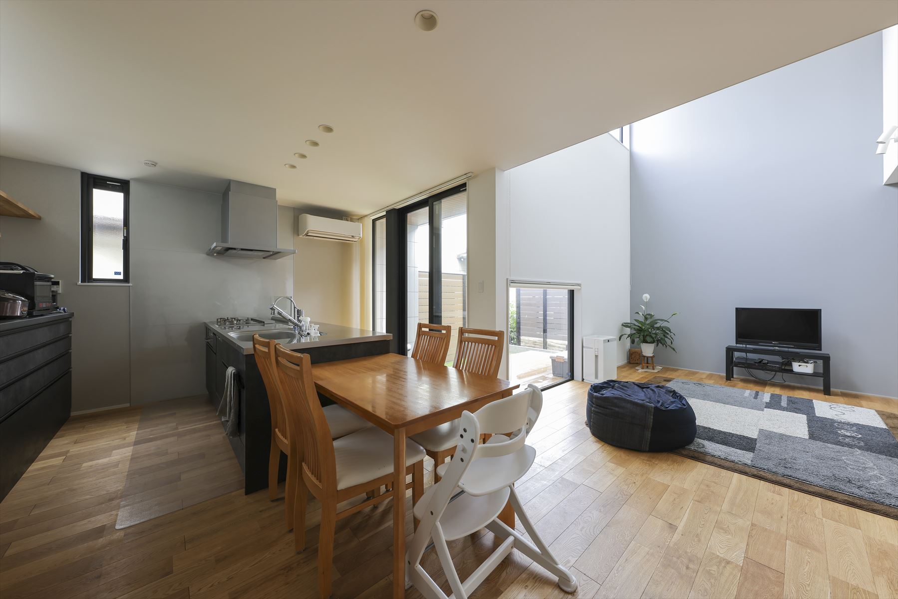 南面(左側)隣家が迫っている北側道路の敷地ですが、効果的に設けた吹抜けで十分な日当たり。