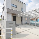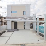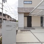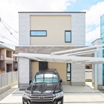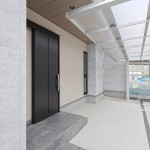 ファーストプレゼンよりコストの関係と玄関庇の面積にYさんのこだわりが入り、アルミのルーバーの採用を見送り、大型庇を付け加えました。大型庇部分はLIXILさんのタイル(ストーンタイプコレクション)を採用、重厚感のある面持ちに。