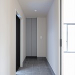 40坪の敷地に大きな車2台分の駐車スペースとなると、通常は玄関エリアは最小限…となりがちですが、あえて抜け感のある佇まいにすることで家全体に”厚み”を出すよう配慮しました。