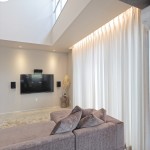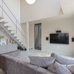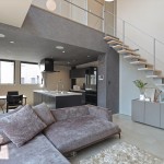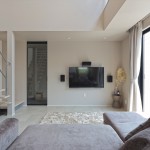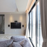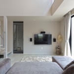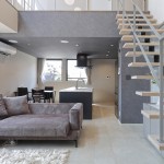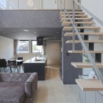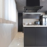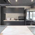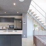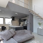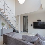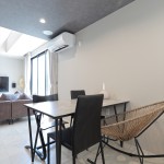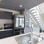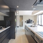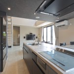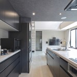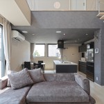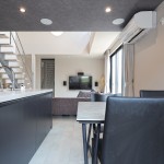 DKの天井高はあえて2m30cmと通常より低めとして、更にグレーの天井で籠った感を出し、リビングの解放感を相対的に強調。