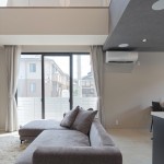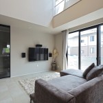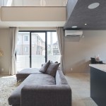 南側隣地が駐車場で日当たりは確保できるものの4方からの視線を切る必要があるので、通常は2階リビングを選択したいところですが、Yさんのご希望は1階LDK。 そこで、1階は採光と通風に努めて内外の繋がりを遮断し、大きな吹抜けを設けて上部からの補助採光と抜け感を感じるLDK空間としました。