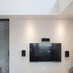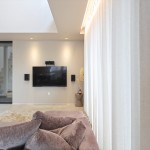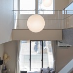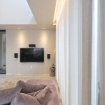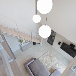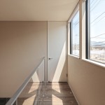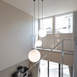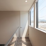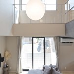 2階の廊下からの情景にもこだわり。リビングからモディファイ(照明)を通して吹抜けの先にある天井付けの窓を望むことができます。