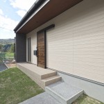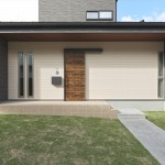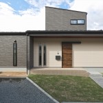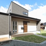 幅広で、箱感を強調した重心の低い外観デザイン。2階を設けたことで結果的にフォルムに安定感が出た。玄関まわりの白に近いベージュの木目はお施主さまのこだわりポイント。芝山が全体の色合いをまとめるアクセントになった。