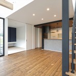 下がり天井のキッチン➡ダイニング➡吹抜けリビングと末広がりの天井とすることで、リビングの広さを強調しました。