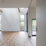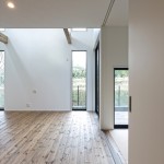 リビングから自然と目に入る緑と空。吹抜けを設けることにより、水平方向だけでなく垂直方向にもダイナミックな絶景が広がる。床は無垢パイン。ウッドデッキも繋がり、広さ以上の広がりを感じます。