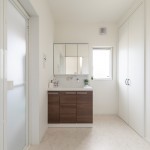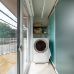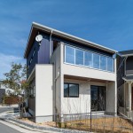 境界線に対して斜めに配置したので、他の家と向きが45°ずれています。ずれていますが角地なので景観を崩していません。建物を斜めに配置すると、お庭がいくつもに分割されてしまいますが、「駐車スペース×2カ所」、物置を置く他人から見られたくない「裏庭」、サニタリーから出ることができる洗濯物を干す「家事庭」の4つそれぞれに異なった機能を持たせることで無駄なく敷地を利用しました。