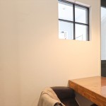 無垢オーク床材とグレーの壁の相性は抜群。メインの採光を側面からとすることで、キッチンからテレビを正対で鑑賞することができる。