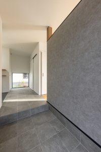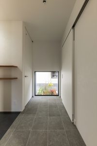 玄関入った視線の先に地窓。ホール部分までタイルフロアで抜け感を出した
