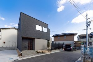 箱を組み合わせたようなスッキリとした外観デザイン。玄関まわりには“SOLIDO”をあしらって質感アップ。目隠しフェンスは道路から2.2mの高さまで設け、テラスデッキのプライバシーをしっかり確保。