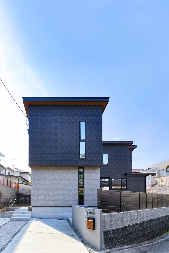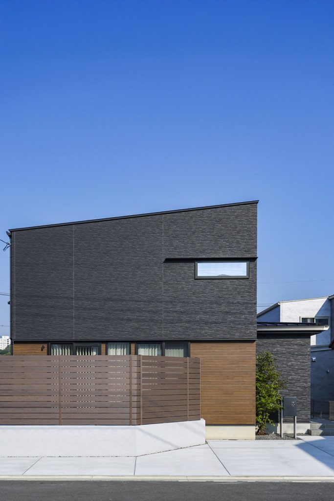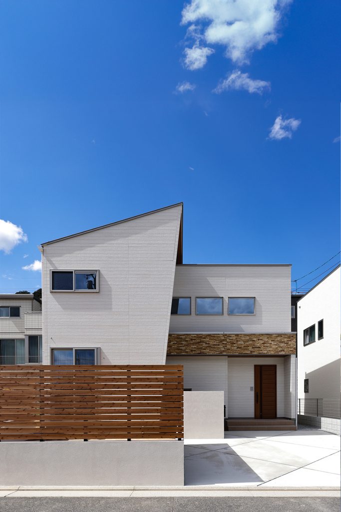北東角地の高台にある扇形の土地に建つ家